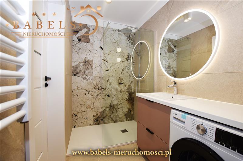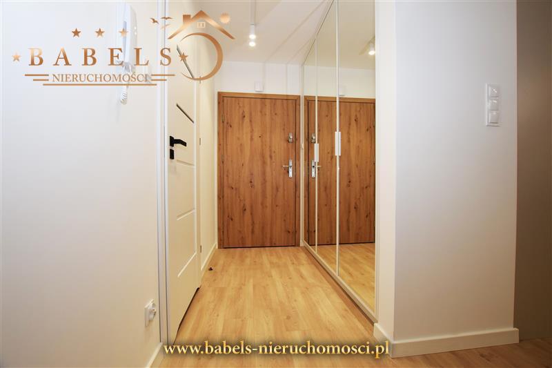 Całość utrzymana w nowoczesnym stylu. Na podłogach w salonie i kuchni oraz przedpokoju panele, natomiast w łazience kafle. Na ścianach gładź, a dodatkowo w salonie designerska kompozycja z tapety i ozdobnych elementów, natomiast w łazience kafelki, a w kabinie efektowna mozaika. W przedpokoju szafa w zabudowie z siedziskiem wyposażona w lustra.