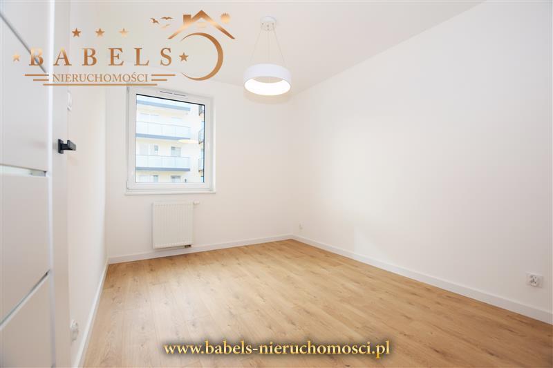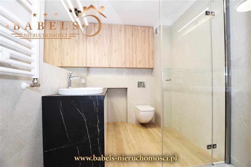 Całość zupełnie nowa, utrzymana w nowoczesnym stylu. Na podłogach panele zarówno w salonie jak i w kuchni, oraz w sypialni i przedpokoju. Natomiast w łazience kafle. Na ścianach gładzie. W przedpokoju szafa w zabudowie z siedziskiem i systemem drzwi przesuwnych posiadających lustra.